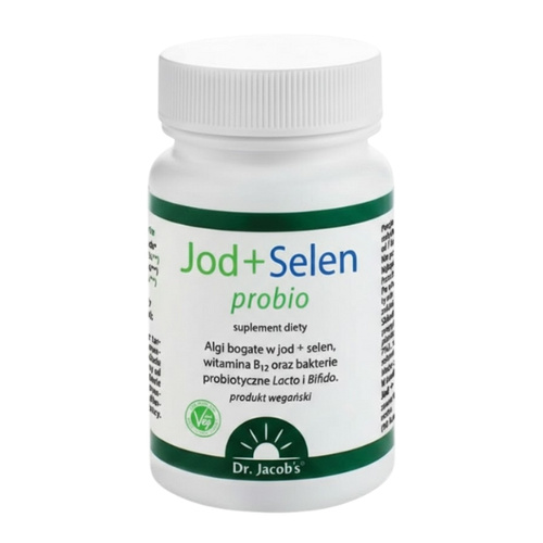 - DR. JACOB'S Jod + Selen Probiotyk to kompleksowa formuła wspierająca prawidłowe funkcjonowanie tarczycy oraz zdrową mikroflorę jelitową. Produkt zawiera jod, selen, witaminę B12 oraz miliardy probiotycznych bakterii w kapsułkach roślinnych.